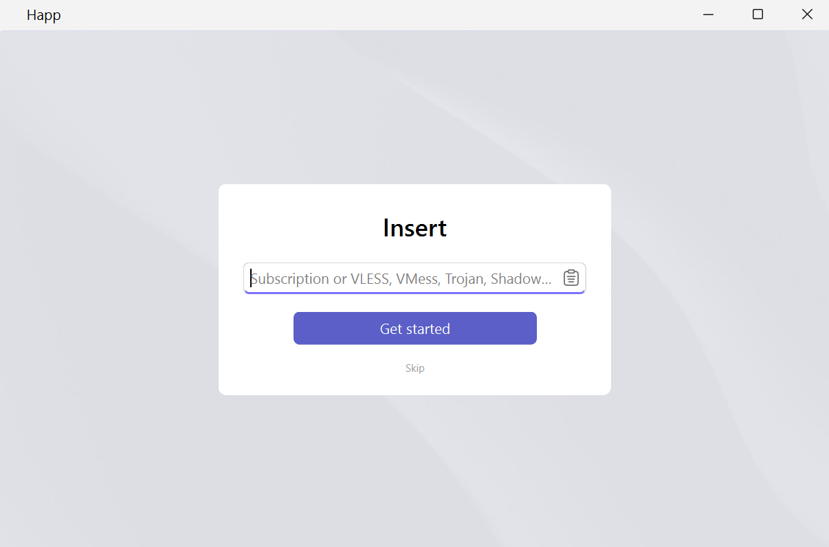 - Введите скопированную ссылку в приложение «Happ» и нажмите «Get started»