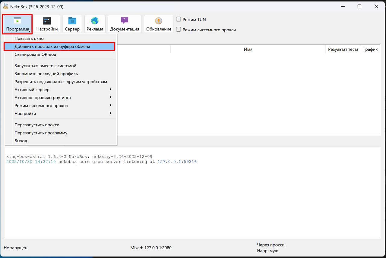 - Добавьте подписку в «Nekoray» на компьютере — «Программа» -> «Добавить профиль из буфера обмена»
