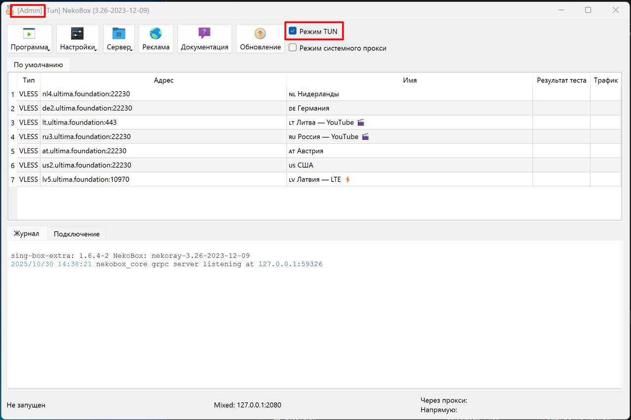 Обязательно поставьте галочку «Режим TUN» — это нужно для корректной работы